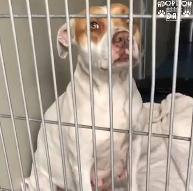 Zia was found inside a kennel, trembling so hard that the metal door rattled with her fear.