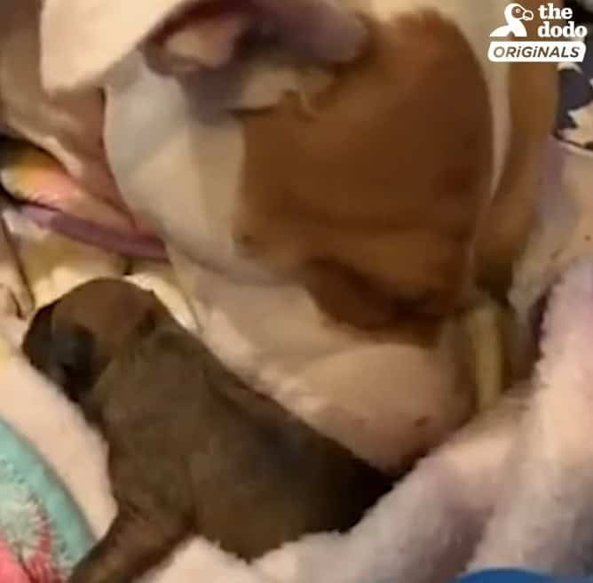 Zia immediately began cleaning them, licking each puppy with careful focus.