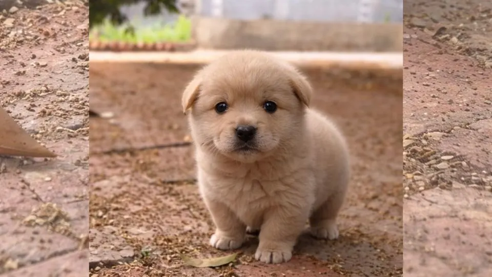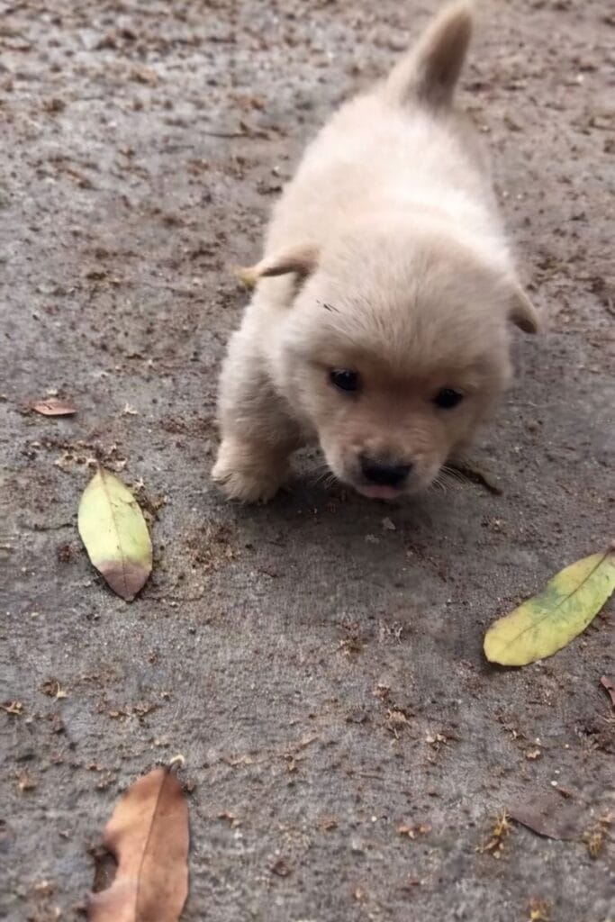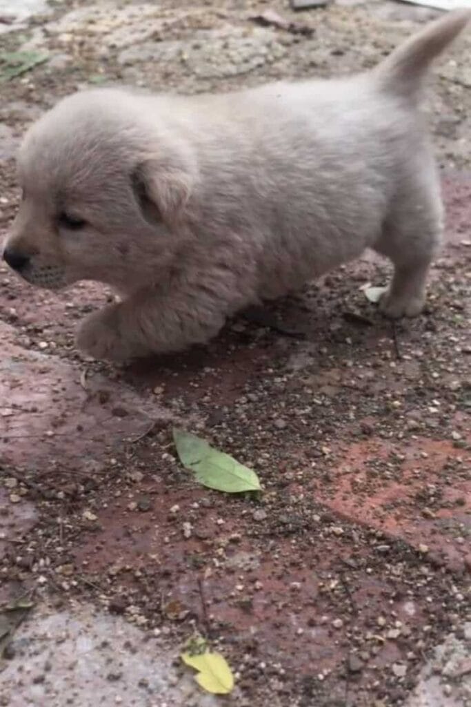 A tiny puppy stood alone on cold, wet bricks, his round paws unsteady beneath him.